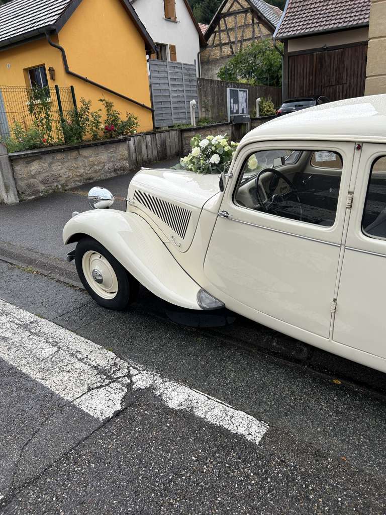 Parfois, ce sont les détails les plus simples qui font toute la différence. En option, la Citroën Traction Avant peut être décorée avec de jolis rubans satinés bleu, blanc ou rouge, noués avec soin pour souligner l’élégance naturelle de cette voiture de collection.